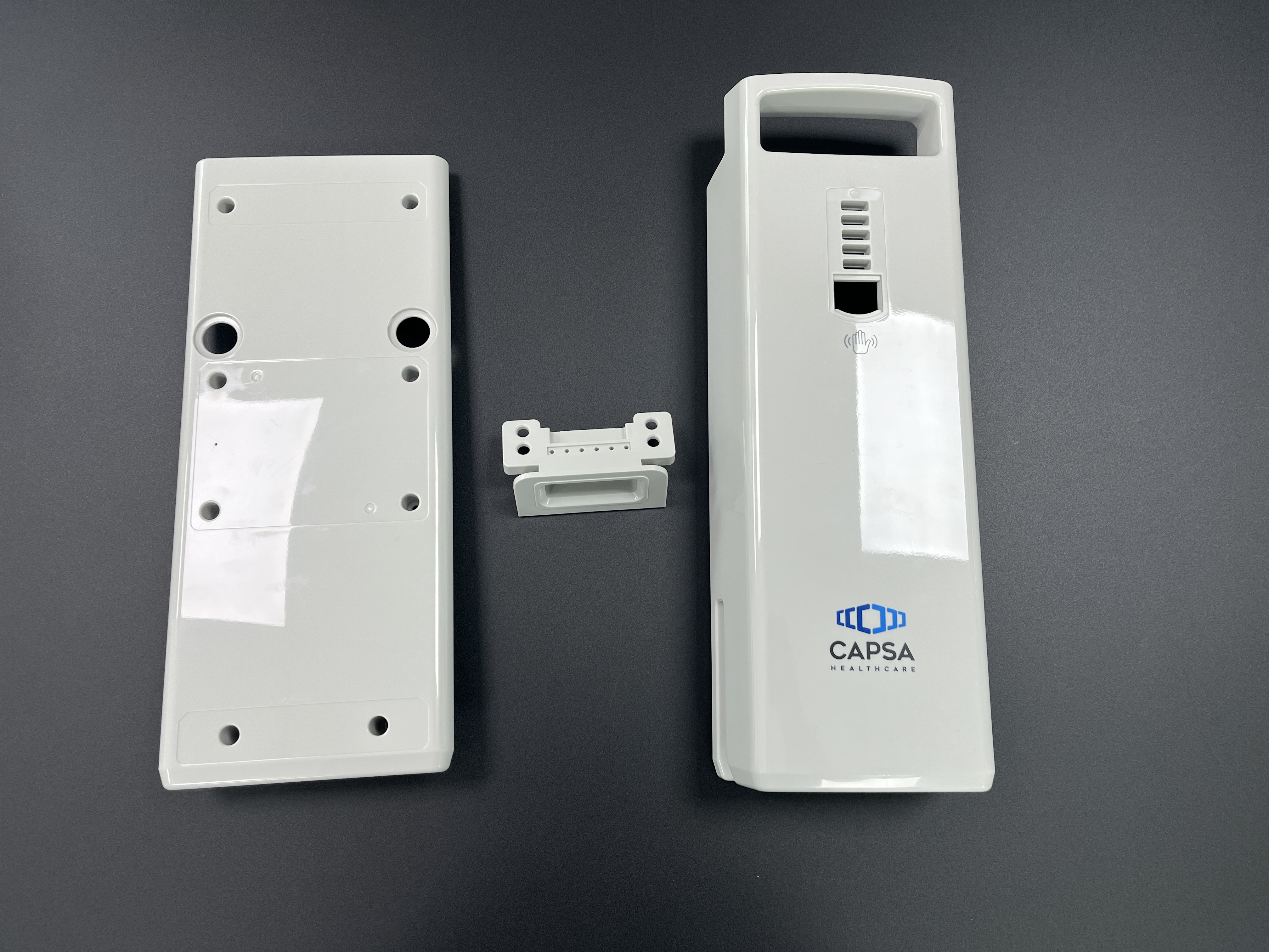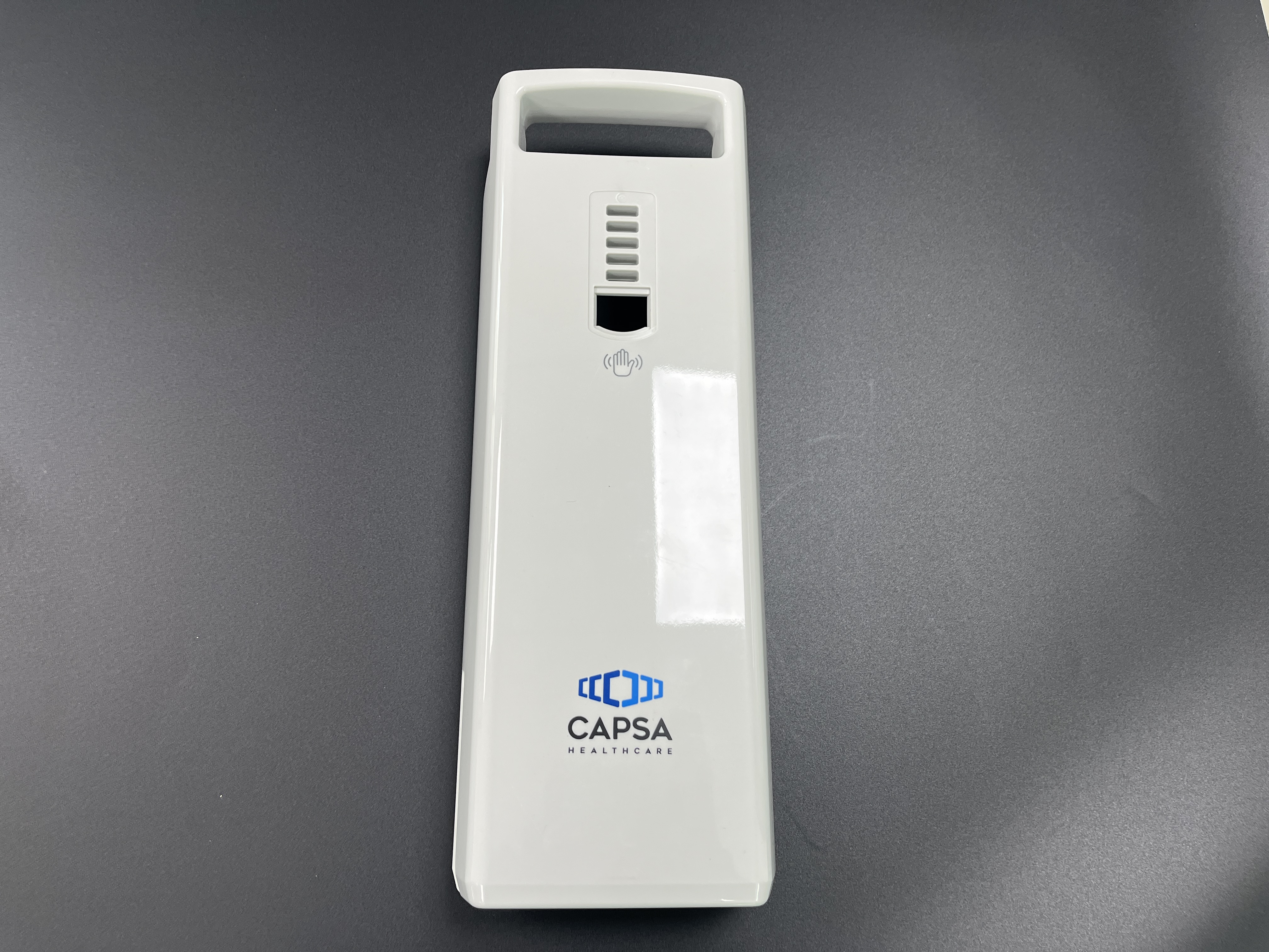 На глянцевой, устойчивой к царапинам поверхности напечатан логотип CAPSA Healthcare, что обеспечивает чистый, профессиональный внешний вид, соответствующий строгим гигиеническим стандартам больниц и клиник.